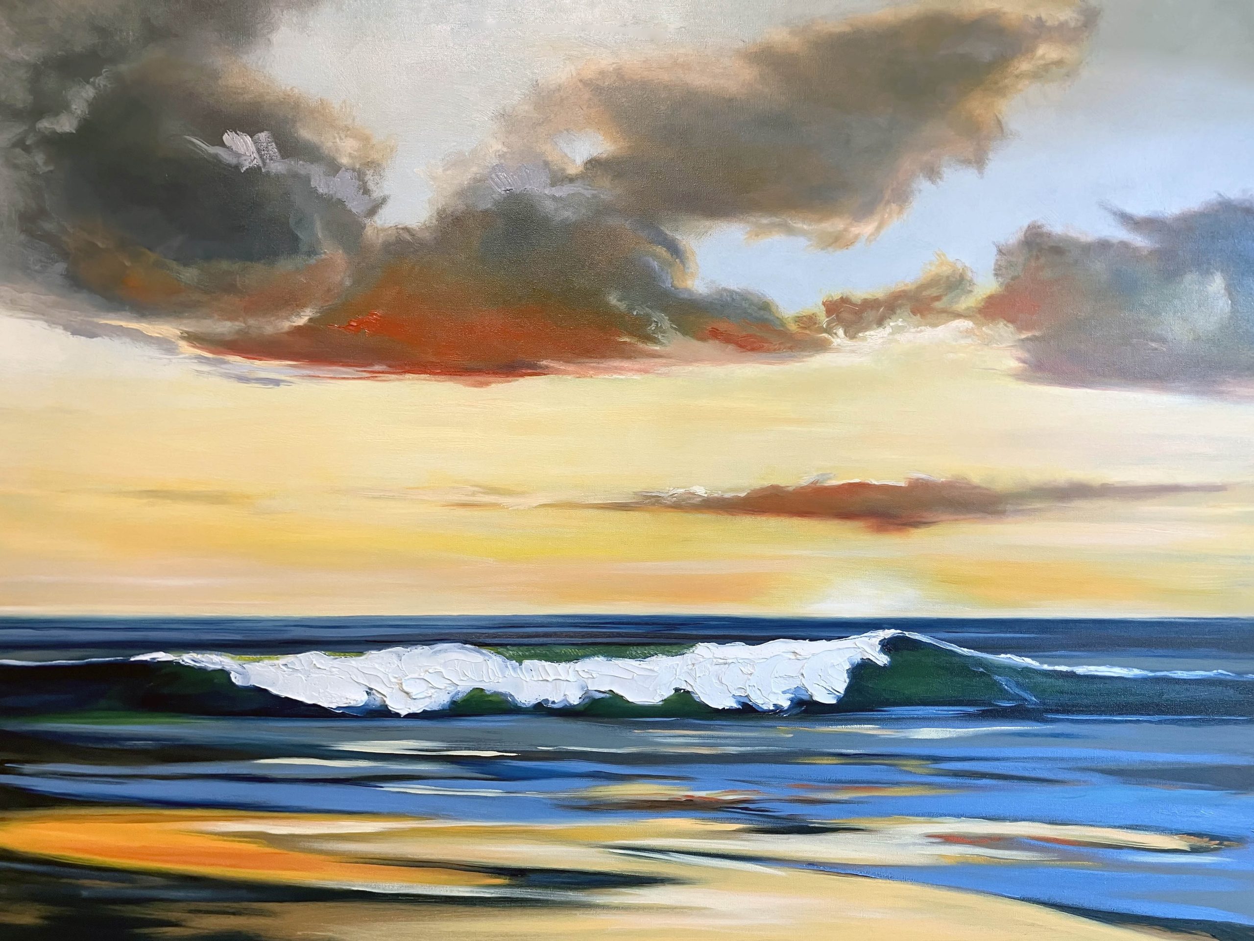 This painting made it to Port A Art Center on January 20th along with ‘Big Whoop II.’ Hopefully you will get to see it in person. It is quite striking, with much brighter colors than I usually employ. The impasto on the foam of the wave is the icing on the cake more or less. 😉