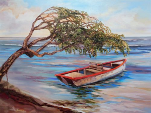 This is an historic Farley boat tethered to a windswept tree on calm waters. The title of the work derives from a favorite song. Imagine peace and love, tranquility and the arrival of a loved one.
